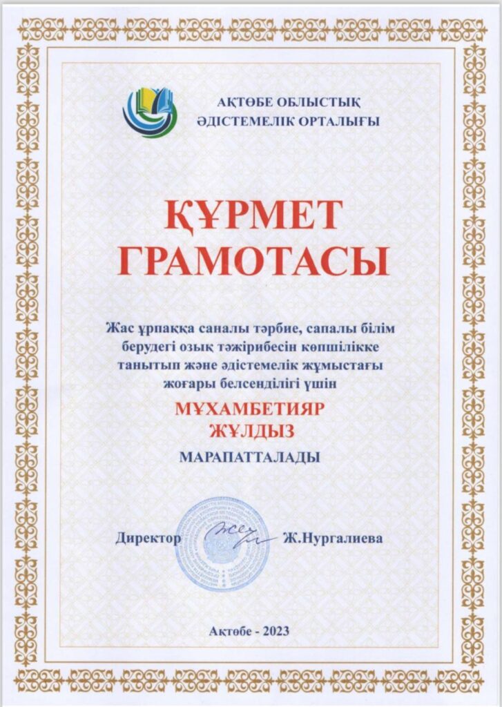 Почётная грамота. “Актюбинский областной методический центр”. г. Актобе, 2023 год.